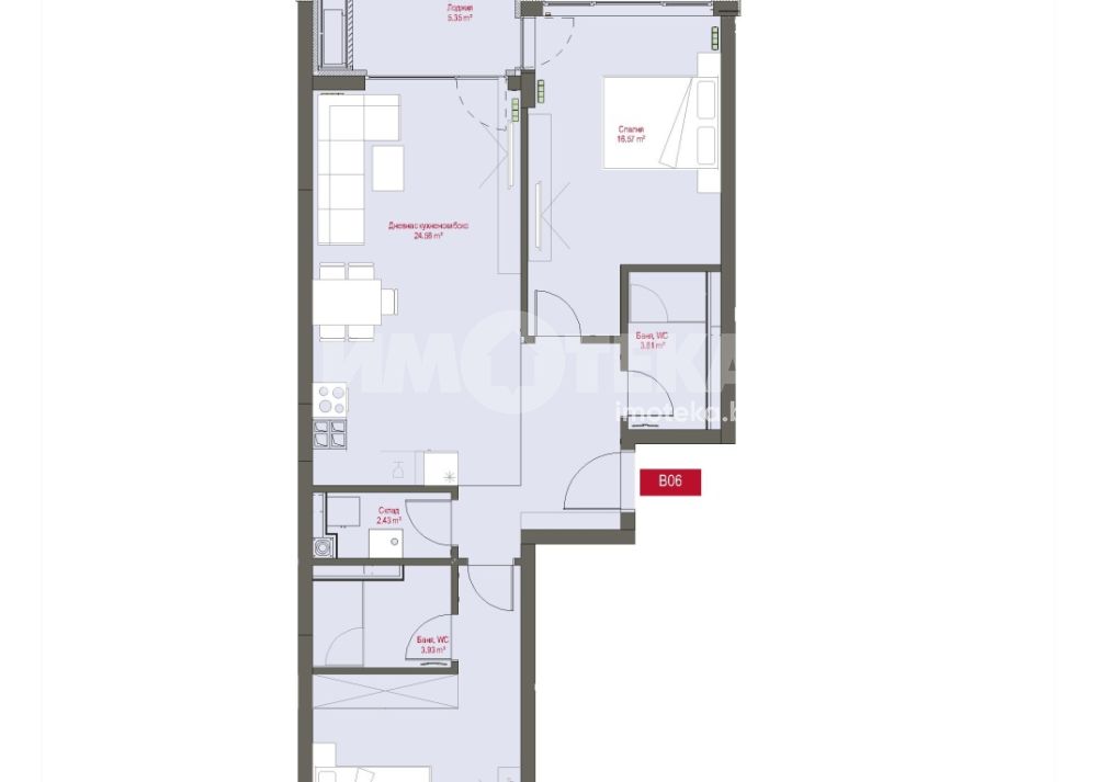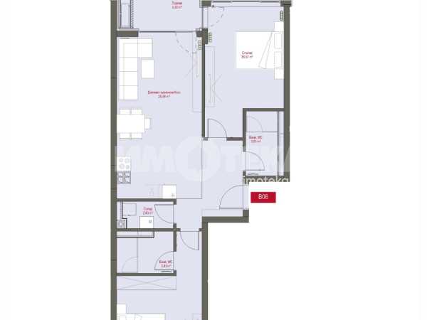 Тристаен апартамент разположен на втори етаж. Изложение Изток-Запад. Застроената площ на жилището е 96 кв.м., разпределени в антре, всекидневна с кухненски бокс и излаз към лоджия, две спални, две бани с тоалетна и склад.