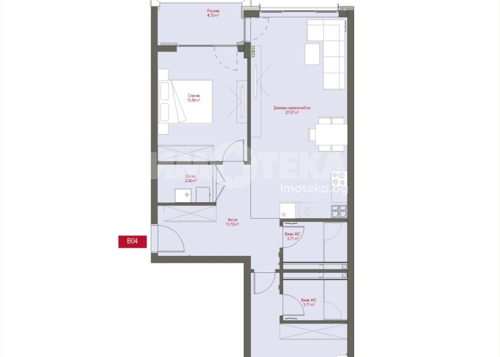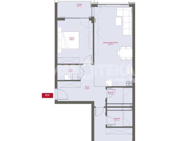 Тристаен апартамент разположен на втори етаж. Изложение Изток-Запад. Застроената площ на жилището е 98 кв.м., разпределени в антре, всекидневна с кухненски бокс и излаз към лоджия, две спални, две бани с тоалетна и склад.