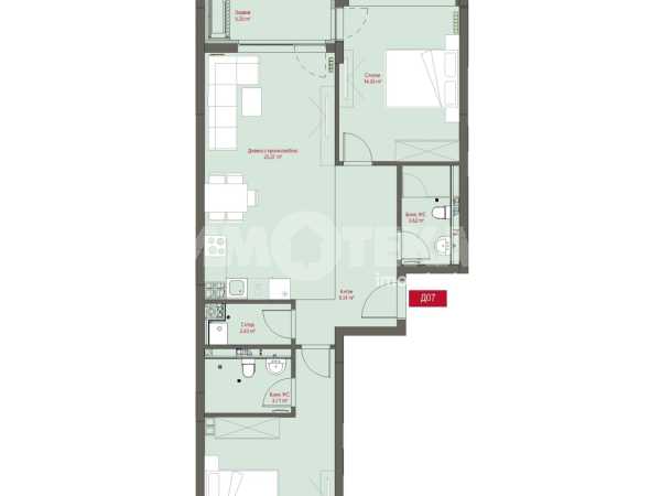 Тристаен апартамент разположен на трети етаж. Изложение Изток-Запад. Застроената площ на жилището е 96 кв.м., разпределени в антре, всекидневна с кухненски бокс и излаз към лоджия, две спални, едната със собствена баня с тоалетна, втора баня с тоалетна и склад.