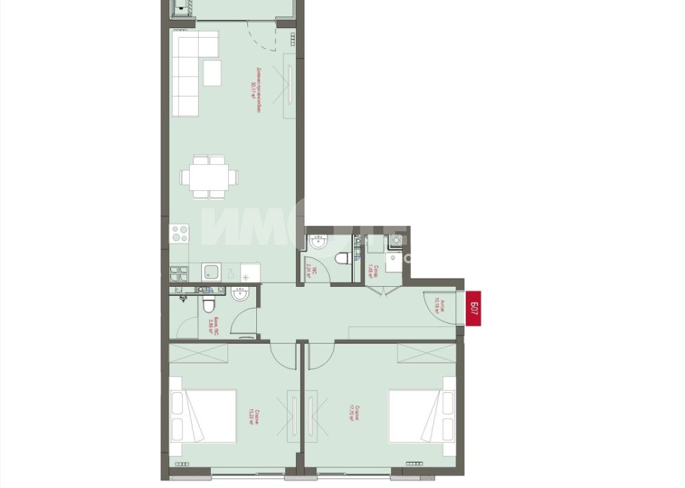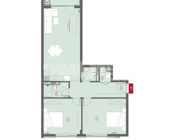 Тристаен апартамент разположен на трети етаж. Изложение Юг-Север. Застроената площ на жилището е 101 кв.м., разпределени в антре, всекидневна с кухненски бокс и излаз към лоджия, от която се разкрива гледка към Витоша планина, две спални, баня с тоалетна, самостоятелна тоалетна и склад.