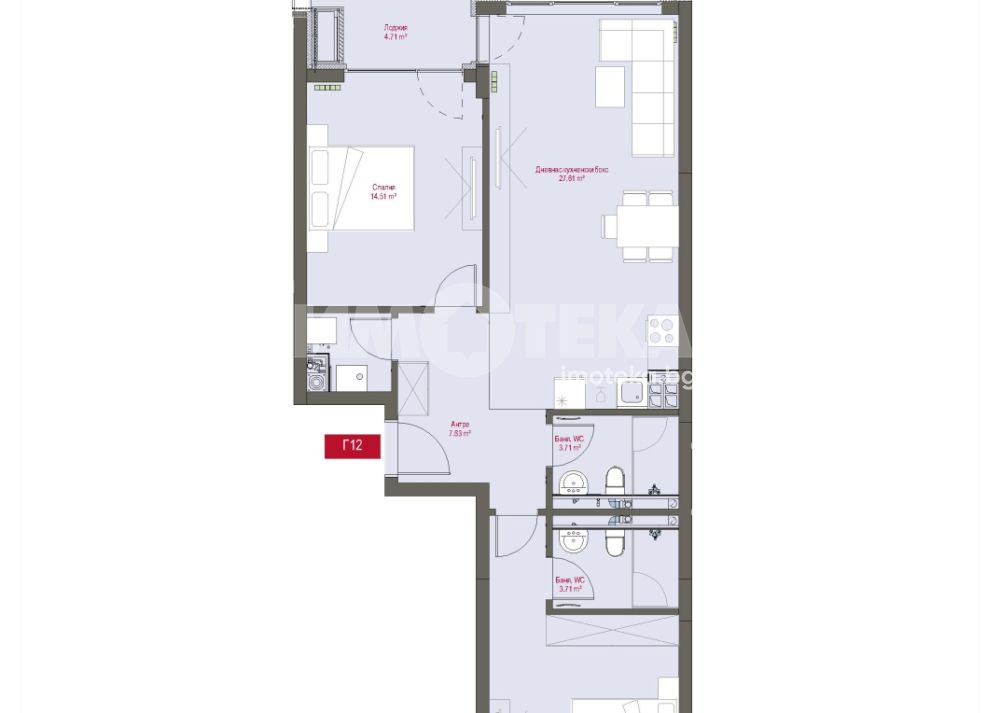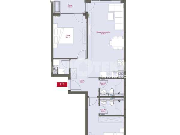 Тристаен апартамент разположен на четвърти етаж. Изложение Изток-Запад. Застроената площ на жилището е 95 кв.м., разпределени в антре, всекидневна с кухненски бокс и излаз към лоджия, две спални - едната със собствена баня с тоалетна, втора баня с тоалетна, дрешник и склад.