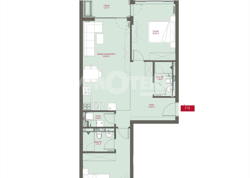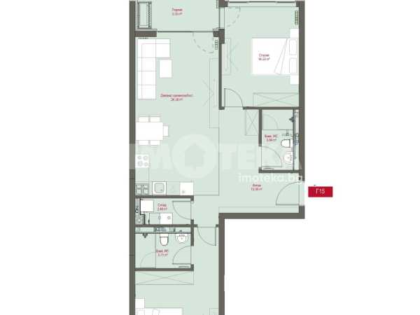 Тристаен апартамент разположен на четвърти етаж. Изложение Изток-Запад. Застроената площ на жилището е 99 кв.м., разпределени в антре, всекидневна с кухненски бокс и излаз към лоджия, две спални - едната със собствена баня с тоалетна, втора баня с тоалетна, дрешник и склад.