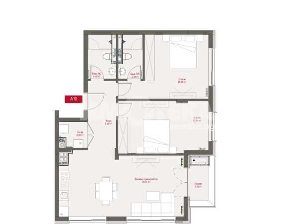 Тристаен апартамент разположен на четвърти етаж. Изложение Изток-Север. Застроената площ на жилището е 100 кв.м., разпределени в антре, всекидневна с кухненски бокс и излаз към тераса, от която се разкрива гледка към зелените пространства на сградата, две спални - едната със собствена баня с тоалетна, втора баня с тоалетна и склад.