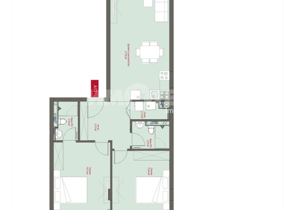 Тристаен апартамент разположен на четвърти етаж. Изложение Юг-Север. Застроената площ на жилището е 96 кв.м., разпределени в антре, всекидневна с кухненски бокс и излаз към лоджия с гледка към Витоша планина, две спални - едната със собствена баня с тоалетна, втора баня с тоалетна, дрешник и склад.