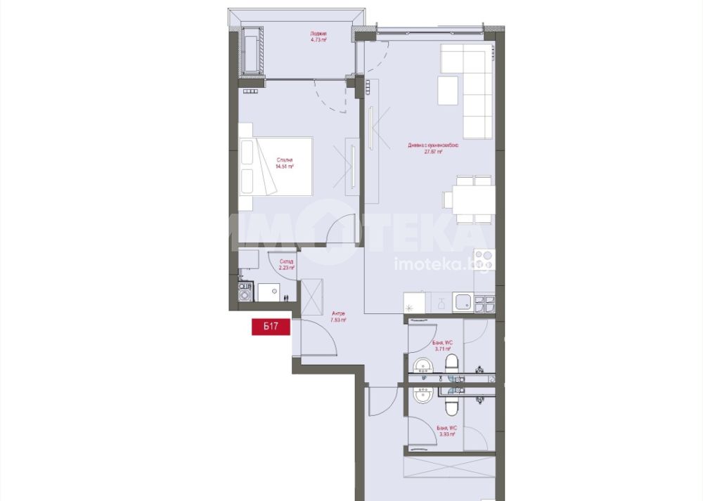 Тристаен апартамент разположен на четвърти етаж. Изложение Изток-Запад. Застроената площ на жилището е 95 кв.м., разпределени в антре, всекидневна с кухненски бокс и излаз към лоджия, две спални - едната със собствена баня с тоалетна, втора баня с тоалетна, дрешник и склад.