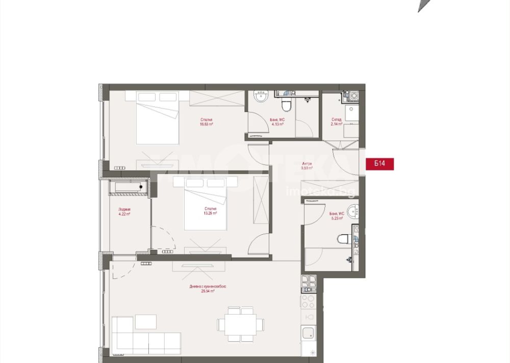 Тристаен южен апартамент разположен на четвърти етаж. Изложение Юг. Застроената площ на жилището е 99 кв.м., разпределени в антре, всекидневна с кухненски бокс и лоджия с гледка към Витоша планина, две спални - едната със собствена баня с тоалетна, втора баня с тоалетна, дрешник и склад.