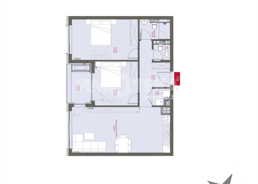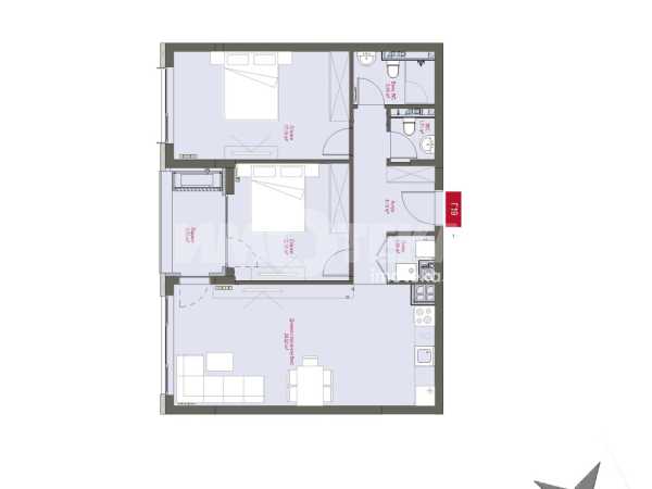 Тристаен апартамент разположен на пети етаж. Изложение Изток. Застроената площ на жилището е 91 кв.м., разпределени в антре, всекидневна с кухненски бокс и излаз към лоджия, от която се разкрива гледка към зелените пространства на сградата, две спални, баня с тоалетна, самостоятелна тоалетна, дрешник и склад.