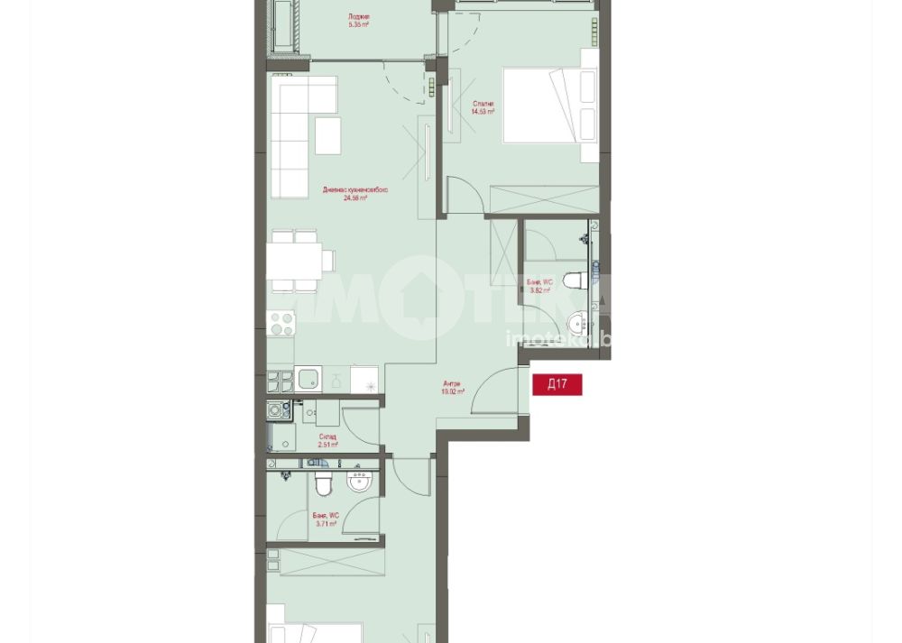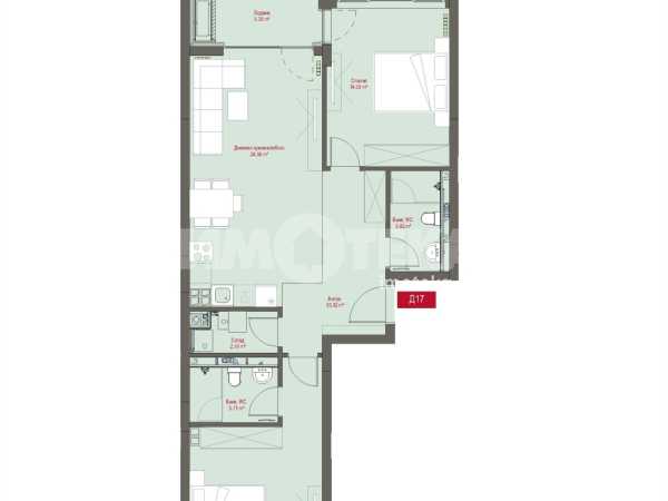 Тристаен апартамент разположен на пети етаж. Изложение Изток-Запад. Застроената площ на жилището е 96 кв.м., разпределени в антре, всекидневна с кухненски бокс и излаз към лоджия, две спални - едната със собствена баня с тоалетна, втора баня с тоалетна, дрешник и склад.