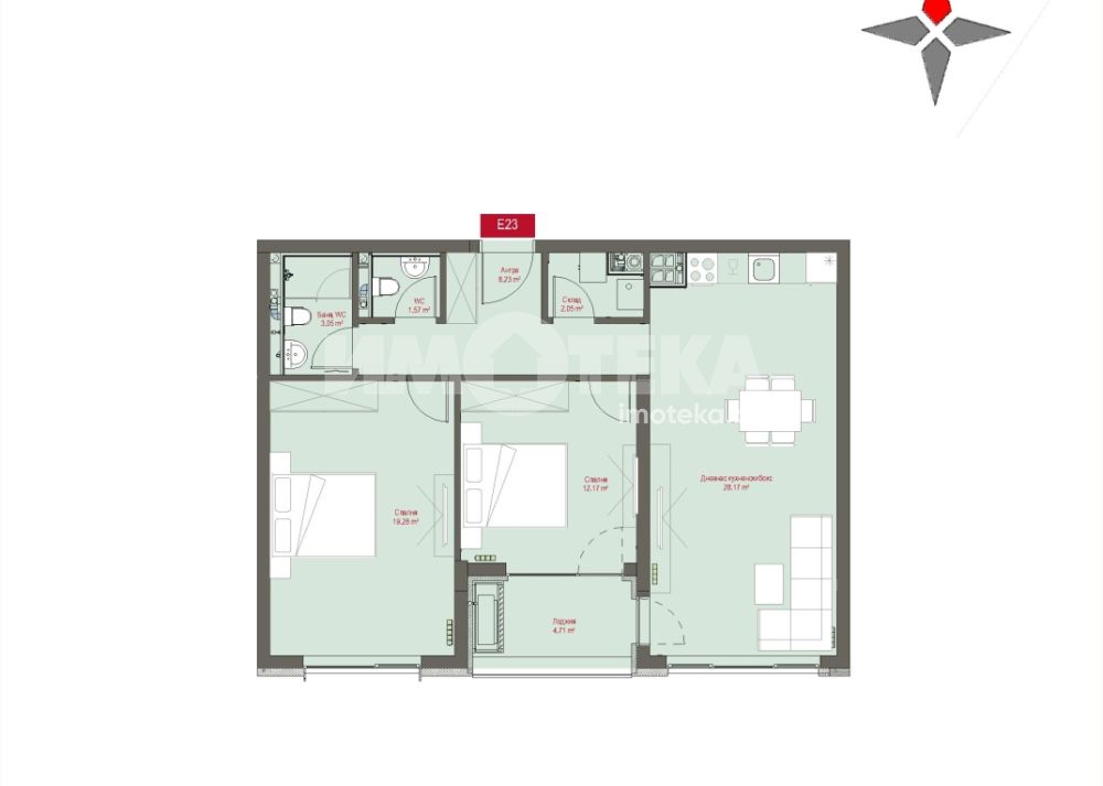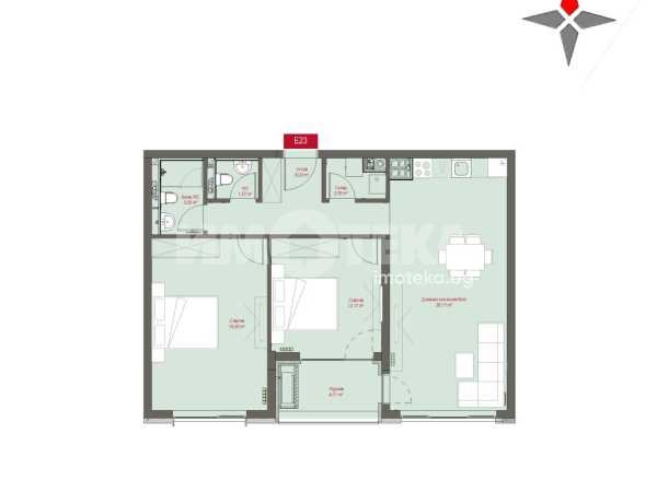 Тристаен южен апартамент разположен на пети етаж. Изложение Юг. Застроената площ на жилището е 94 кв.м., разпределени в антре, всекидневна с кухненски бокс и излаз към лоджия, от която се разкрива гледка към зелените пространства на сградата и Витоша планина, две спални, баня с тоалетна, самостоятелна тоалетна, дрешник и склад.