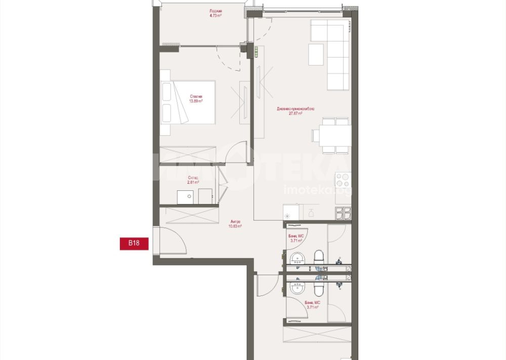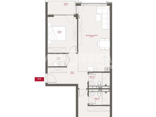Тристаен апартамент разположен на пети етаж. Изложение Изток-Запад. Застроената площ на жилището е 100 кв.м., разпределени в антре с дрешник, всекидневна с кухненски бокс и излаз към лоджия, две спални - едната със собствена баня с тоалетна, втора баня с тоалетна и склад