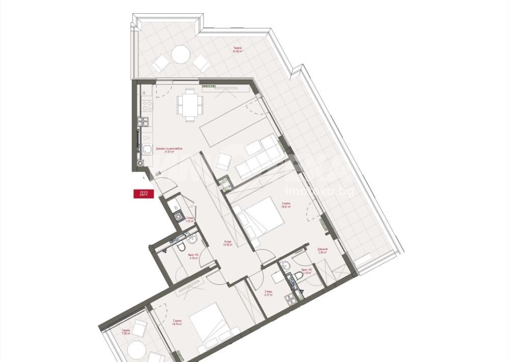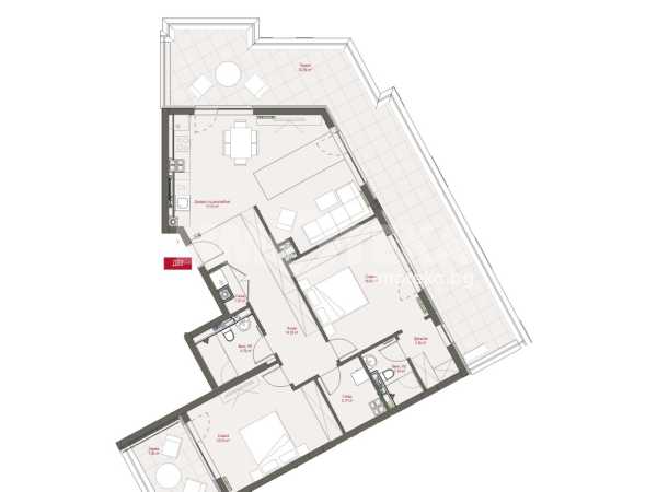 Тристаен апартамент разположен на шести етаж. Изложение Юг-Запад-Север. Застроената площ на жилището е 165 кв.м., разпределени в голямо антре с два склада и дрешник, просторна дневна с кухненска част и трапезария, панорамна тераса с гледка към Витоша планина, две спални - едната родителска със собствена баня с тоалетна и дрешник, а другата с южна тераса, както и втора баня с тоалетна.