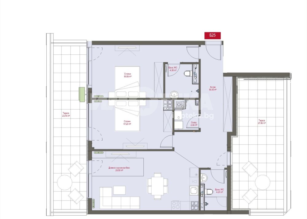 Тристаен южен апартамент разположен на шести етаж. Изложение Юг-Север. Застроената площ на жилището е 161 кв.м., разпределени в просторно антре със склад, дрешник, баня с тоалетна, южна всекидневна с кухненски бокс и панорамна тераса с гледка към зелените пространства на сградата и Витоша планина, две големи спални - едната е родителска със собствена баня, тоалетна и дрешник и още една тераса с изглед към София.