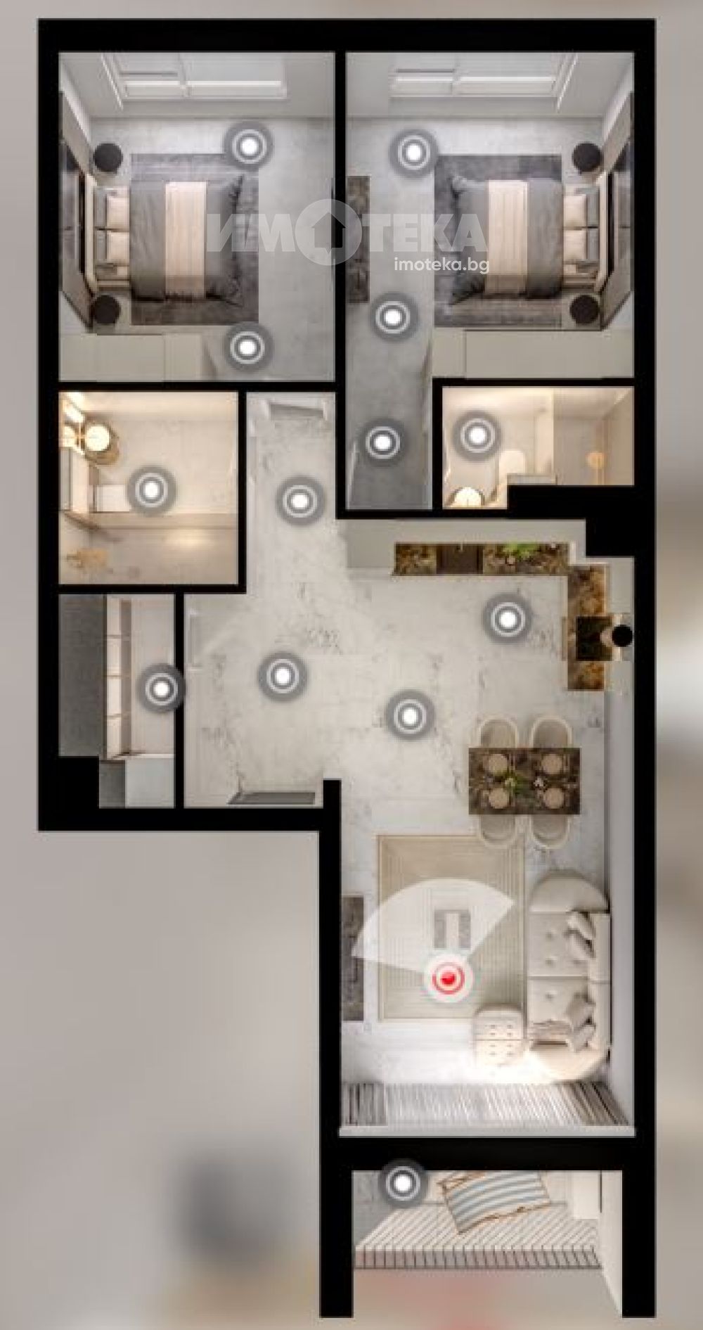 Жилището е с функционално и удобно разпределение. Просторната дневна зона обединява хол, трапезария и кухня в едно общо помещение с излаз към тераса. Двете непреходни  спални осигуряват комфорт и уединение.
