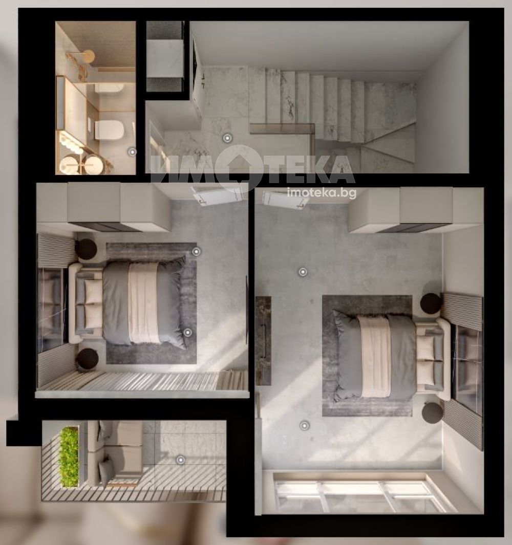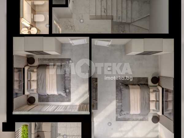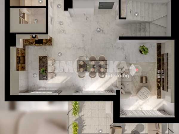 Жилището е разположено на две нива и предлага комфорт и простор. На първото ниво ще откриете светла дневна зона от 50 кв.м. с излаз към уютна дворна тераса и достъп до вътрешен двор – перфектно място за почивка и зеленина. Тук са разположени още баня с тоалетна и практично помещение/склад-гардеробна. Второто ниво включва две спални с тераса и баня с тоалетна, осигуряващи спокойствие и уединение.