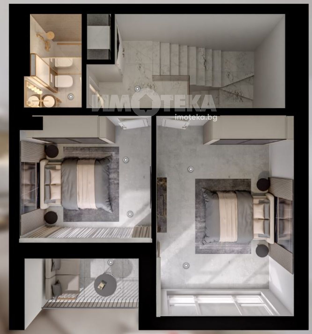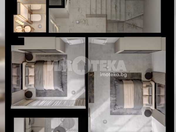 Жилището е разположено на две нива и предлага комфорт и простор. На първото ниво ще откриете светла дневна зона  с излаз към уютна дворна тераса и достъп до вътрешен двор – перфектно място за почивка и зеленина. Тук са разположени още баня с тоалетна и практично помещение/склад-гардеробна. Второто ниво включва две спални с тераса и баня с тоалетна, осигуряващи спокойствие и уединение.