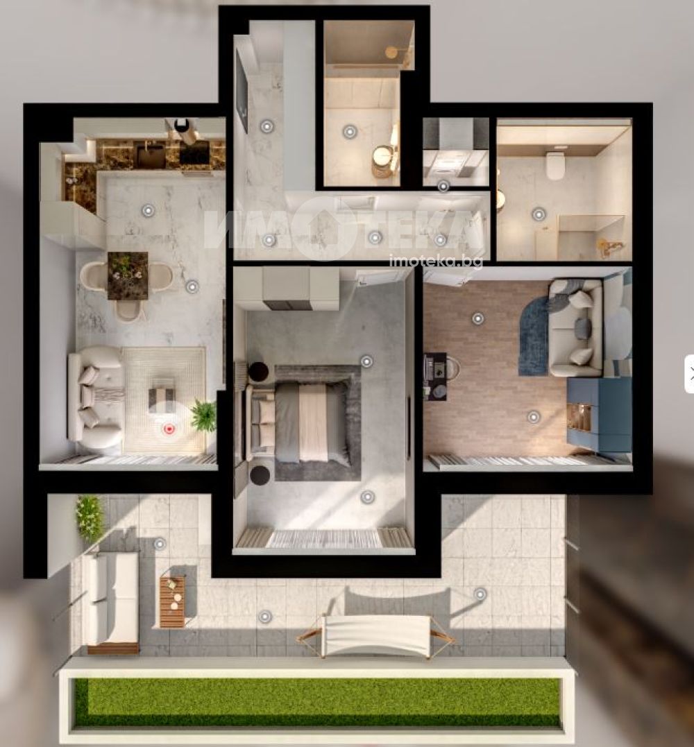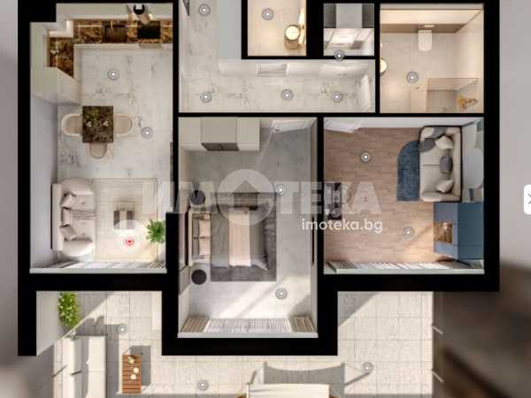 Жилището е с функционално и удобно разпределение. Просторната дневна зона обединява хол, трапезария и кухня в едно общо помещение с излаз към тераса. Двете непреходни  спални осигуряват комфорт и уединение.