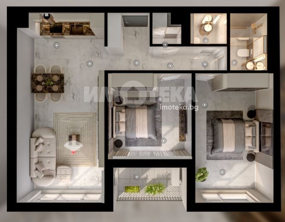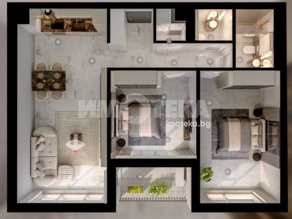 Жилището е с функционално и удобно разпределение. Просторната дневна зона обединява хол, трапезария и кухня в едно общо помещение с излаз към тераса. Двете непреходни  спални осигуряват комфорт и уединение.