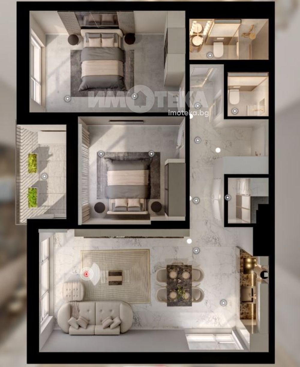 Жилището е с функционално и удобно разпределение. Просторната дневна зона -  30кв.м обединява хол, трапезария и кухня в едно общо помещение с излаз към тераса. Двете непреходни  спални осигуряват комфорт и уединение.