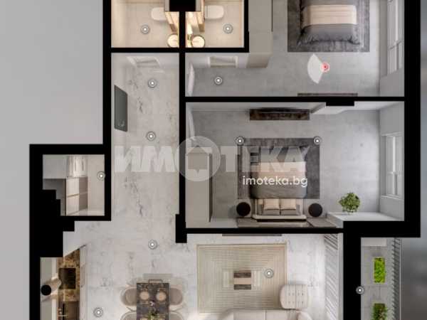 Жилището е с функционално и удобно разпределение. Просторната дневна зона -  29кв.м обединява хол, трапезария и кухня в едно общо помещение с излаз към тераса. Двете непреходни  спални осигуряват комфорт и уединение.