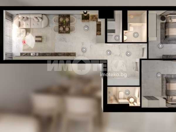 Жилището е с функционално и удобно разпределение. Просторната дневна зона -   обединява хол, трапезария и кухня в едно общо помещение с излаз към тераса. Двете непреходни  спални осигуряват комфорт и уединение.