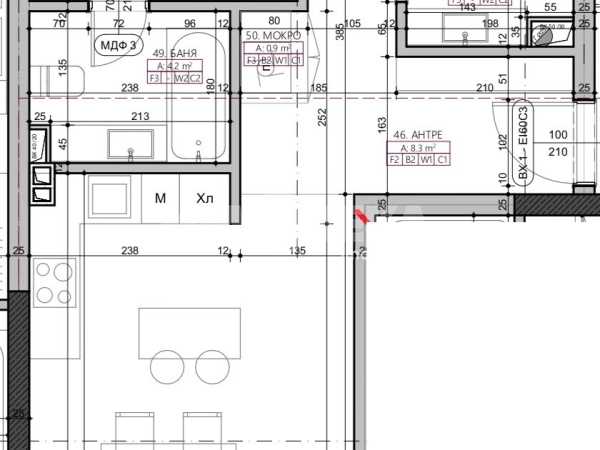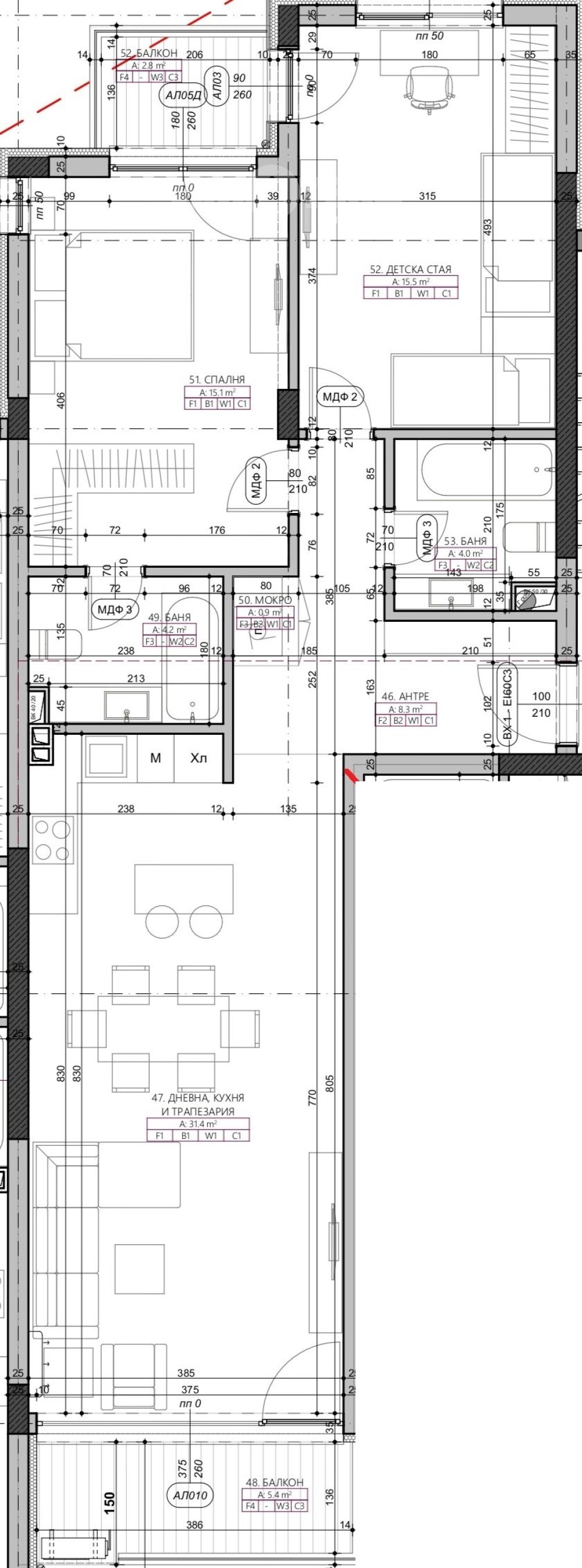 Предлагаме просторен, тристаен апартамент в новострояща се луксозна, бутикова сграда, със застроена площ от 102 кв.м., състоящ се от входно антре, дневна с кухненски бокс, две спални, две бани с тоалетни и две тераси. Към апартамента има прилежащо мазе с площ от 3.8 кв.м.