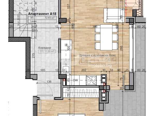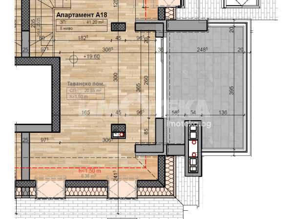 Мезонет със ЗП-129,03м2, РЗП-160.03м2 с две разкошни тераси, разположен на етаж 7 и 8. Апартаментът се състои от първо ниво: антре, дневна с кухненски бокс и трапезария-27,21м2, спалня, баня с тоалетна- 3,55м2, разкошна тераса с площ от 10,38м2; ниво две: едно помещение с площ от-41,20м2, баня с тоалетна-3,55м2 и разкошна тераса с площ от 10м2. Към апартамента има мазе с площ от-3.96 м2. Цената е без ддс.