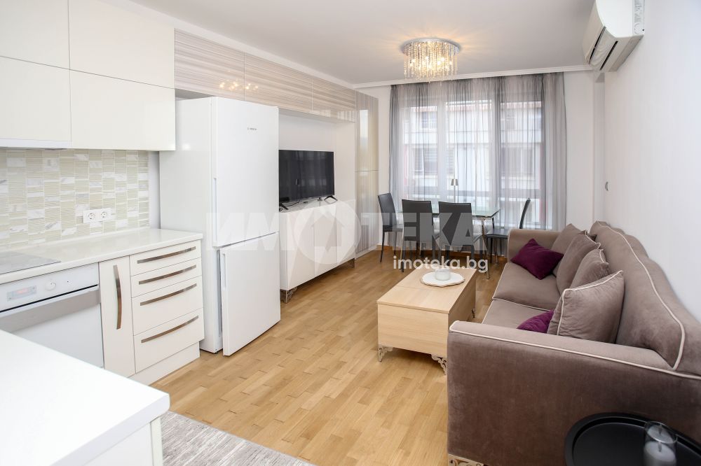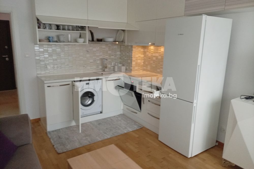 -- > Оборудвана кухня и всекидневна: Вградена фурна с котлони и абсорбатор, вградена пералня, хладилник с фризерна част, телевизор, диван - не разтегателен, холна маса, кухненска маса разтегателна;