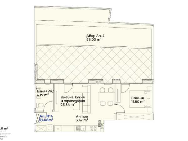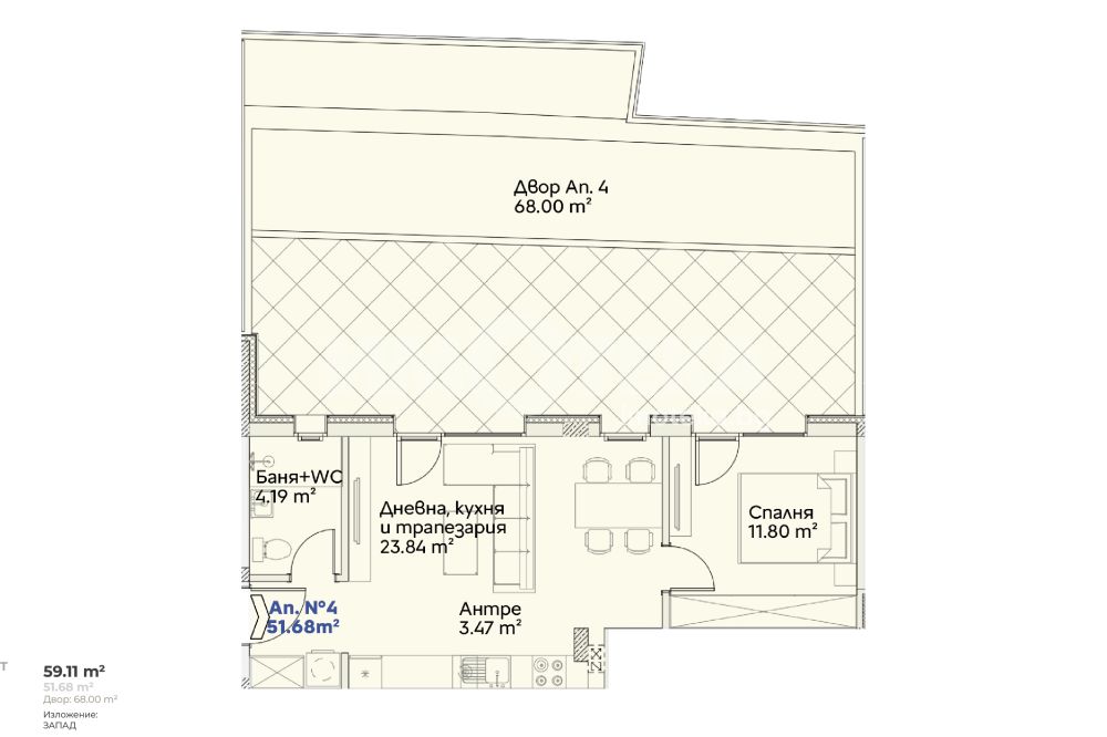 Двустаен апартамент на партерно ниво с РЗП-59,11м2, ЗП-51,68м2 с разпределение; антре, дневна с кухненски бокс и трапезария-23,84м2, спалня-11,80м2,баня с тоалетна-4,19м2, веранда с двор-68м2. Изводи за термопомпа, при желание може и подово отопление. Подземни ПМ и гаражи.