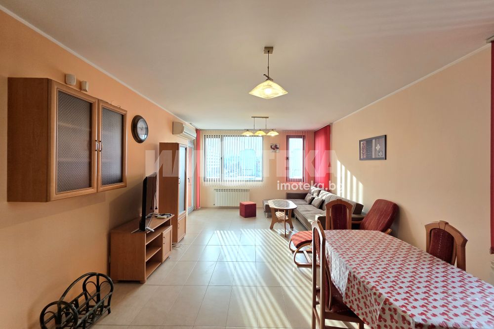 Предлагаме прекрасен, голям, /80 кв.м./ южен двустаен апартамент в сграда Астра в Манастирски ливади. Апартаментът се състои от голяма дневна с кухненски бокс, спалня, баня с тоалетна, коридор и тераса тип лоджия с панорамна гледка към Витоша. Жилището е оборудвано с всички необходими ел.уреди /хладилник, фурна, телевизор/. Настилките в дневната са гранитогрес и естествен дървен паркет в спалнята. Застроена площ 69 кв.м. Възможност за покупка на подземен гараж с площ 23м2.