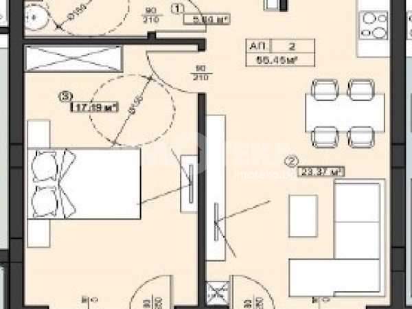 Дневна с кухненски бокс и трапезария, спалня, баня с тоалетна и тераса с излаз от двете помещения.
