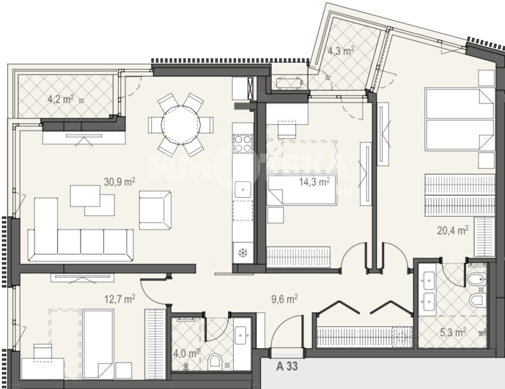 Многостаен апартамент с югозападно изложение и площ от 143 кв.м. Състои се от просторен хол с кухненски бокс, три големи спални, едната със самостоятелна баня с WC, втора баня с WC, две тераси.