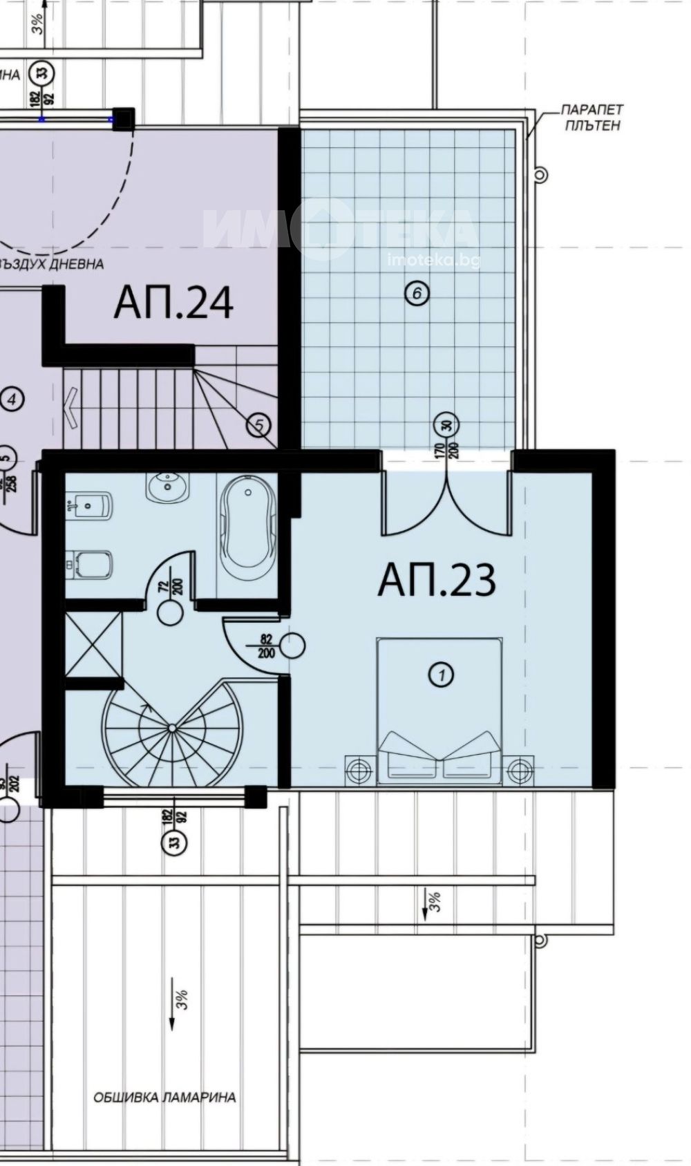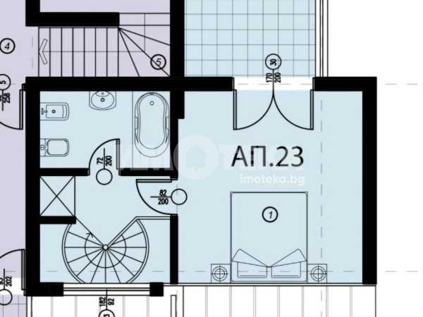 Тристаен мезонет- първо ниво просторна дневна с тераса, от която се разкива гледка към Витоша, спалня, баня с тоалатена и мокро помещение. Второ ниво голяма спалня с тераса с гледка към цяла София и баня с тоалетна. Монтирани климатици Мицубиши.