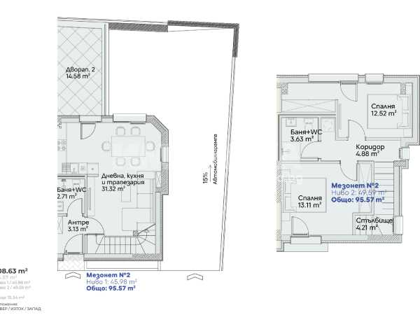 Тристаен апартамент тип мезонет, с РЗП-108,63м2, ЗП-95,57м2, раположен на две нива със следното разпределение: на ниво партер са разположени: антре, дневна с трапезария и кухненски бокс 31,32м2, баня с тоалетна-2,71м2, веранда двор-15,34м2; на ниво две: две спални-12,52м2 и 13,11м2, баня с тоалетна- 3,63м2. Изводи за термопомпа, при желание може и подово отопление. Подземни ПМ и гаражи.
