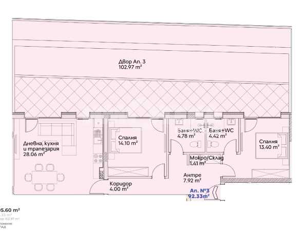 Тристаен апартамент с РЗП-105,60м2, ЗП-92,33м2 със следното разпределение: на ниво партер са разположени: антре, дневна с трапезария и кухненски бокс- 28,06м2, веранда и двор-102,97м2, две спални -13,40м2 и 14,10м2, две бани с тоалетни - 4,42м2 и 4,78м2. Изводи за термопомпа, при желание може и подово отопление. Подземни ПМ и гаражи.