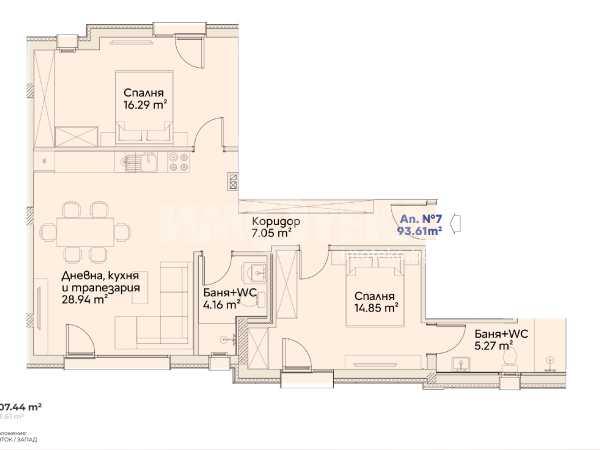 Тристаен апартамент с РЗП-107,44м2, ЗП-93,61м2 със следното разпределение: на етаж първи над партер са разположени: антре, дневна с трапезария и кухненски бокс- 28,94м2, две спални -14,85м2 с баня към нея - 5,27м2, втора спалня-16,29м2, още една баня с тоалетна-4,16м2. Изводи за термопомпа, при желание може и подово отопление. Подземни ПМ и гаражи.