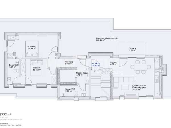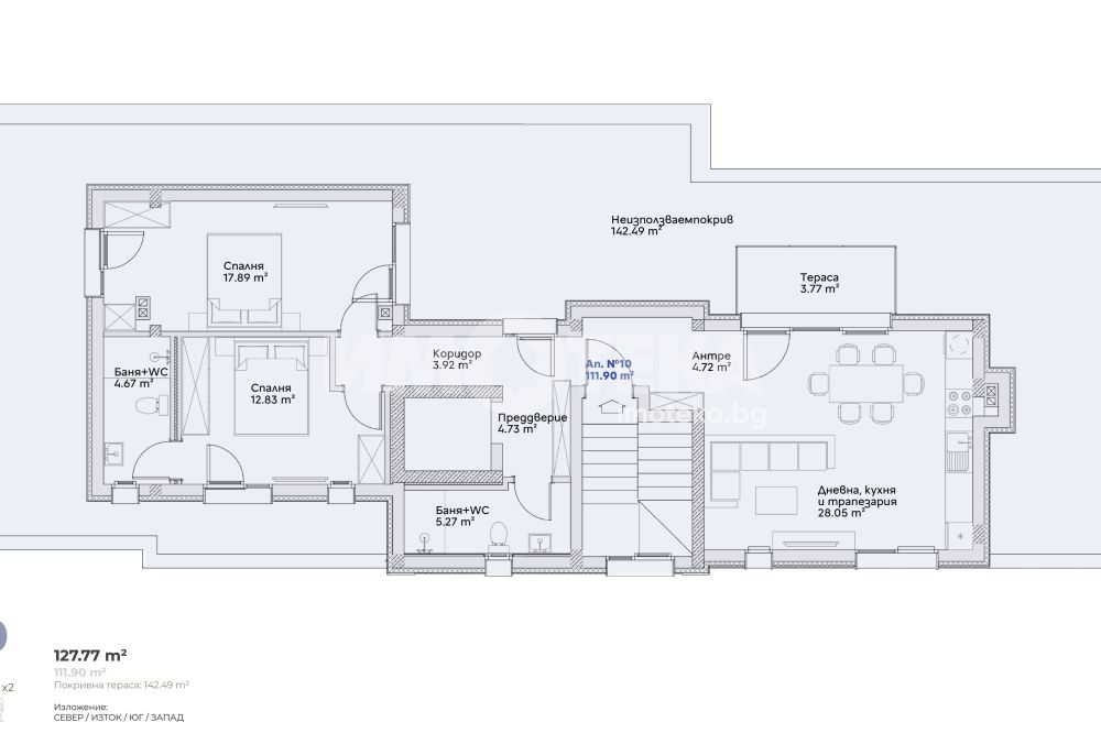 Тристаен апартамент на последен етаж /сам на етажа/ с РЗП-127,77м2, ЗП-111,90 м2 със следното разпределение: на последен четвърти етаж са разположени: антре, дневна с трапезария и кухненски бокс-28,05м2, две спални -12,83м2 и 17,89м2, две бани с тоалетни - 4,67м2 и 5,27м2. Ползване на панорамна покривна тераса с площ от 142,49м2. Изводи за термопомпа, при желание може и подово отопление. Подземни ПМ и гаражи.