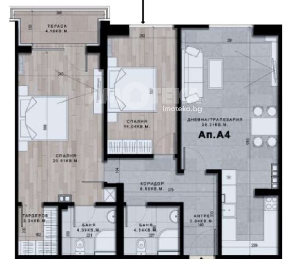 Тристаен апартамент със застроена площ от 108 кв.м. Състои се от: входно антре, коридор, баня с тоалетна, спалня, втора спалня с баня и тоалетна и дневна с кухненски бокс, която е с излаз на тераса.