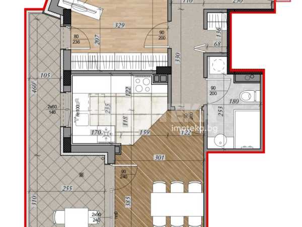 Тристаен апартамент на етаж пети с РЗП-140,50м2, ЗП-122,79м2 и разпределение: дневна с кухненски бокс и трапезария, две спални, две бани с тоалетни и разкошна тераса.