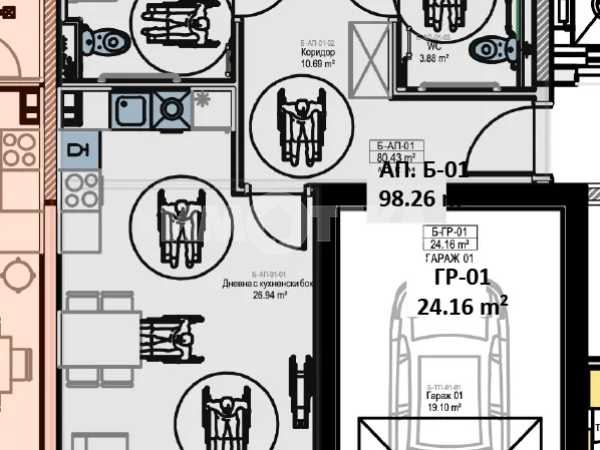 Тристаен апартамент в Младост, със следното разпределение: антре, две спални, баня с тоалетна, тоалетна и всекидневна с кухненски бокс с излаз към личен двор прилежащ към апартамнта.
