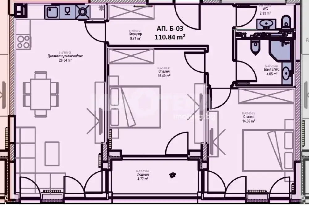 Тристаен апартамент състоящ се от антре, две спални, две бани с тоалетни, всекидневна с кухненски бокс и тераса. Възможност за гараж или паркомясто.