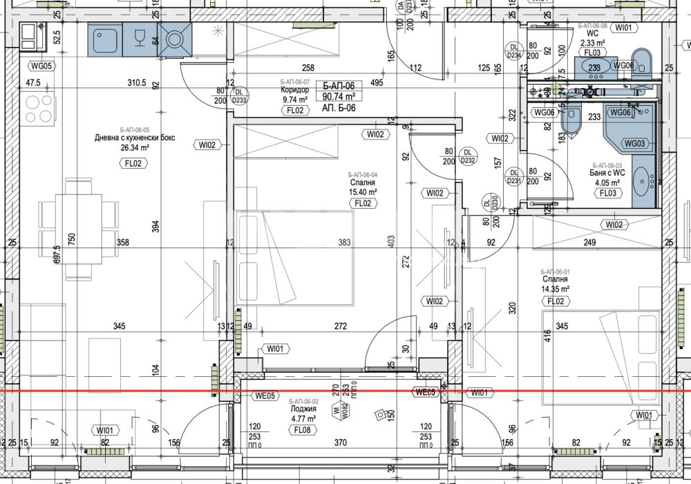 Състои се от хол с трапезария и кухненски бокс 26 кв.м, две спални 14 и 16 кв.м, два санитарни възела, тераса.