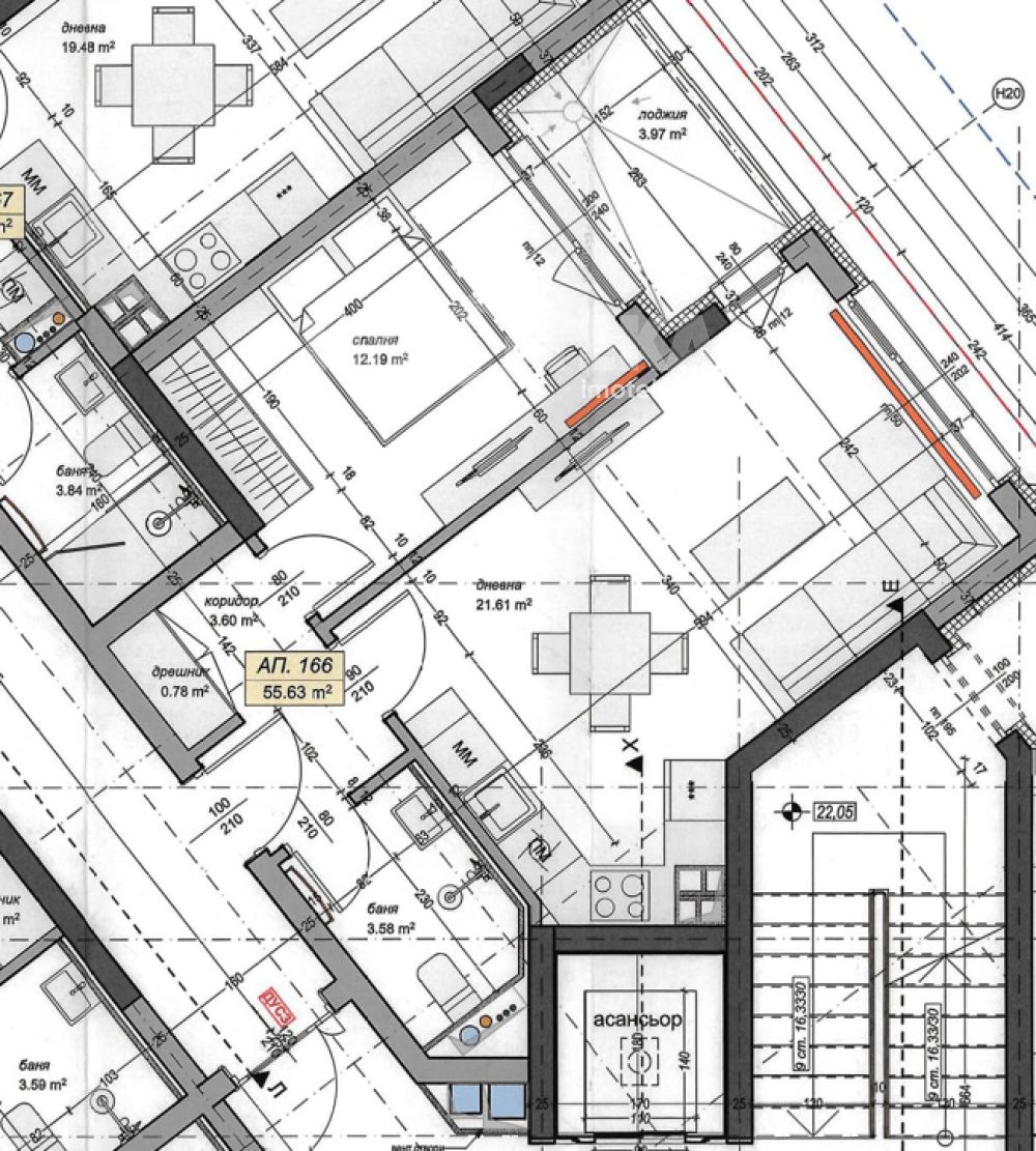 Имотът е със следното разпределение: анре, дневна с трапезария и кухненски бокс, спалня, дрешник, баня с тоалетна, лоджия.