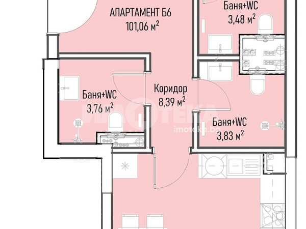 Тристаен апартамент с обща площ от 124.64 кв.м. и ЗП-101,06м2. Състои се от: антре, дневна с кухненски бокс и трапезария, две спални, три бани и две тераси. Изложението е южно. Отоплението е на ТЕЦ. Има възможност за покупка на паркоместа и гаражи.