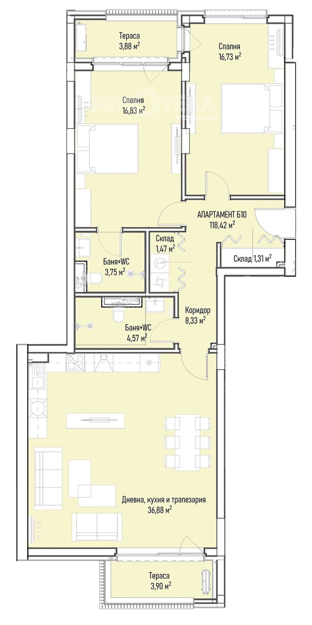Огромен тристаен апартамент на етаж ЧЕТИРИ със ЗП 118.42 м2 и следното разпределение: антре, дневна с кухненски бокс и трапезария- 36,88м2, две спални всяка с площ над 16м2, две бани, склад/мокро и две тераси. ИзложениеЮ/С. Паркоместа подземни.