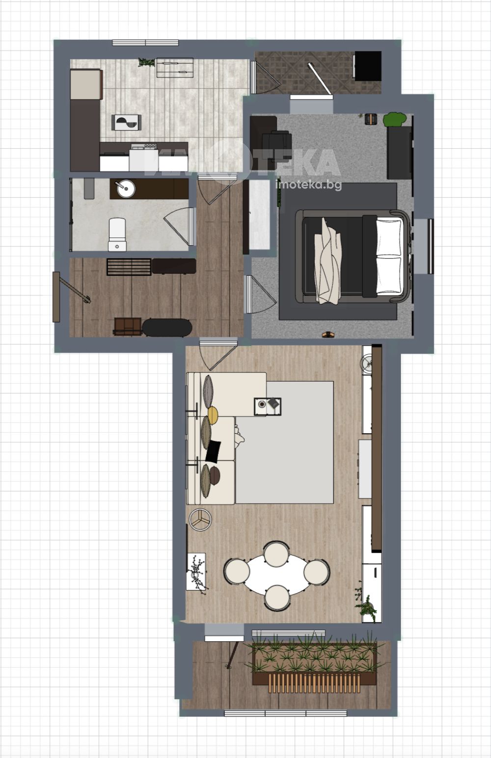 Двустаен апартамент със застроена площ от 66,03 кв.м. (76,04 кв.м. с общи части). Жилището е проектирано с дневна, отделна кухня, спалня, баня с тоалетна и две тераси. Изложения- юг/ изток за дневната, изток за спалнята и север за кухнята. Намира се на първи надпартерен етаж, кота + 2,60м. Към апартамента принадлежи и мазе с площ от 2,05 кв.м.