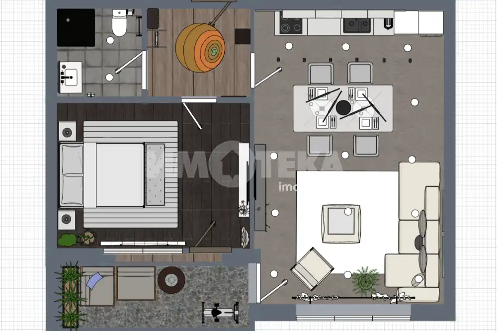 Двустаен апартамент със застроена площ от 55,13 кв.м.(с общи части 63,85 кв.м.). Жилището е проектирано с дневна с кухненски бокс, спалня, баня с тоалетна и тераса. Изложението е изцяло южно. Намира се на първи надпартерен етаж, кота +2,60 м. Към апартамента има мазе с площ от 2,08 кв.м.