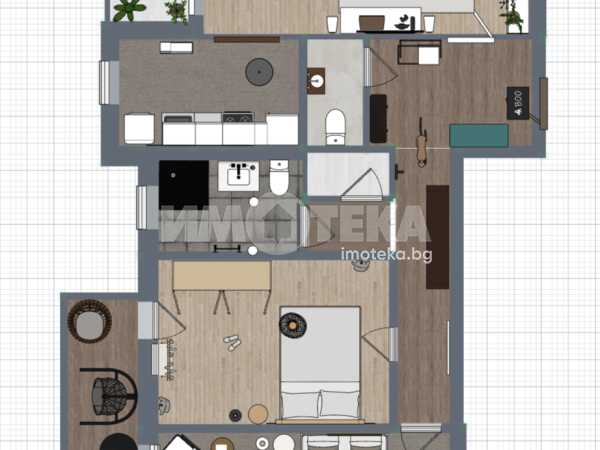 Тристаен апартамент със застроена площ от 94,91 кв.м. (109,09 кв.м. с общи части). Жилището е проектирано с дневна със светъл кухненски бокс, две спални, баня с тоалетна , тоалетна, склад и два балкона. Изложенията са - запад/север за дневната с кухненския бокс, запад за едната спалня и юг/ запад за втората спалня. Намира се на първи надпартерен етаж, кота +2,60м.
