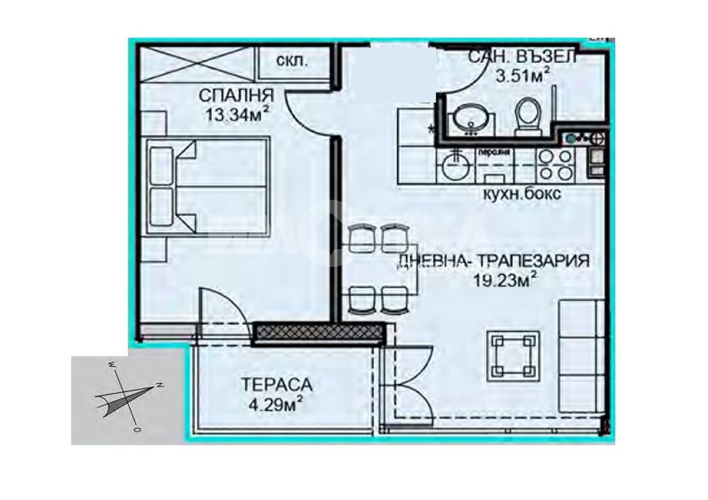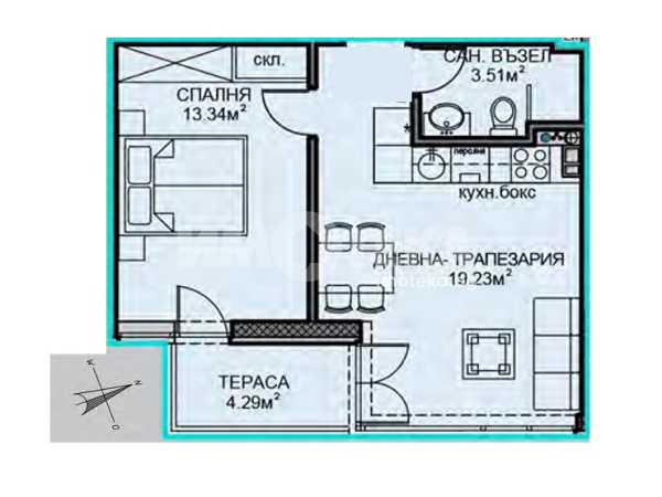 Двустаен апартамент на среден етаж с южно изложение. Състои се от дневна с кухненски бокс, спалня, баня с тоалетна и тераса.