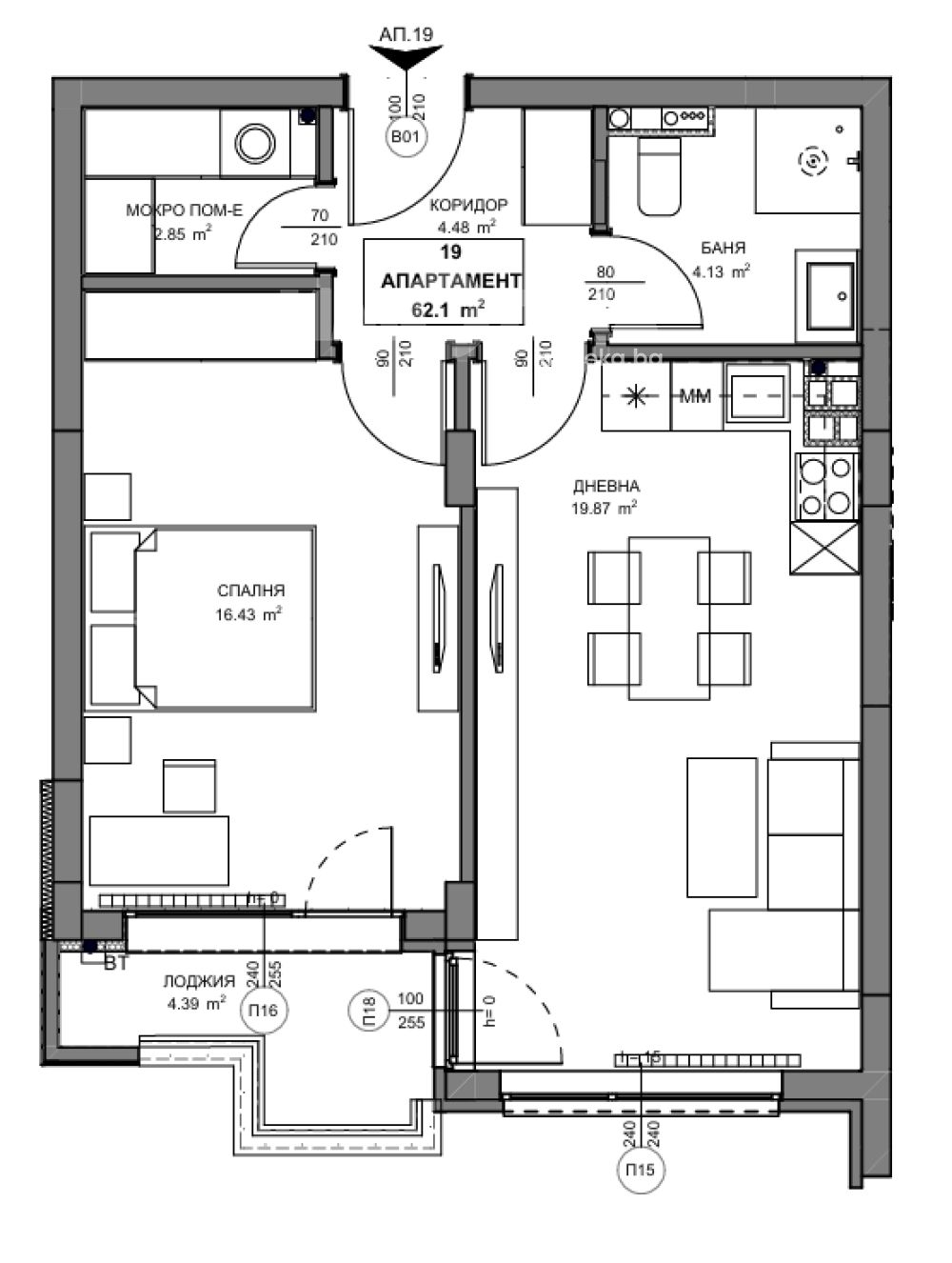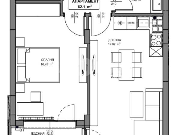 Двустаен апартамент с РЗП- 76,59м², ЗП-62,10м² с включен склад 19-2,97м². Разпределение: коридор, дневна с кухненски бокс и трапезария, спалня, баня с тоалетна, мокро помещение, лоджия. Отопление ТЕЦ. Изложение южно.