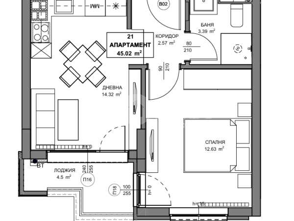 Бюджетен двустаен апартамент с РЗП- 55,75м², ЗП-45,02м² с включен склад 21-2,37м². Разпределение: коридор, дневна с кухненски бокс и трапезария, спалня, баня с тоалетна, лоджия. Отопление ТЕЦ. Изложение южно.